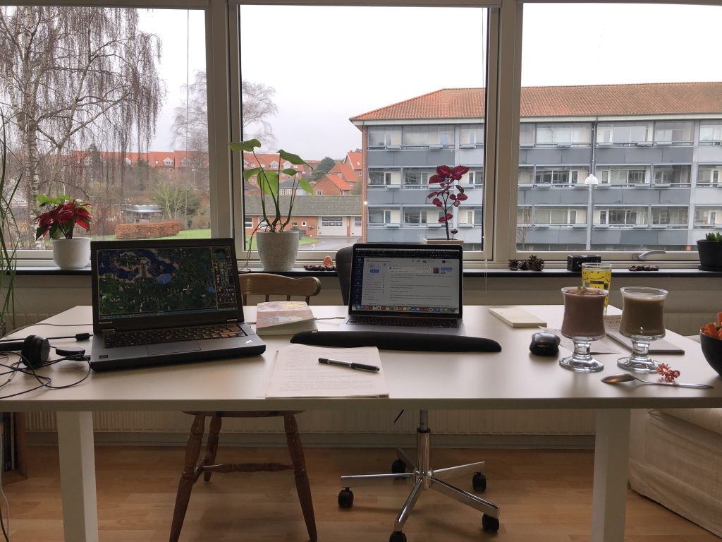 Jeg tog et billede af mit arbejdsbord for et års tid siden. Min skriveproces bestod i at bestikke mig selv maksimalt med snacks og at skifte mellem at skrive en sætning (eller forsøge på det) og tage en tur i Heroes of Might and Magic III. Meget seriøst produktivitetssetup fra et meget seriøst liv.